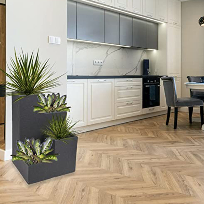 - Crafted from traditional yet modern durable plastic, this innovative stone effect tiered planter in a classic gray color will add style to any space. The material is economical compared to stone, in addition to its strength and durability.