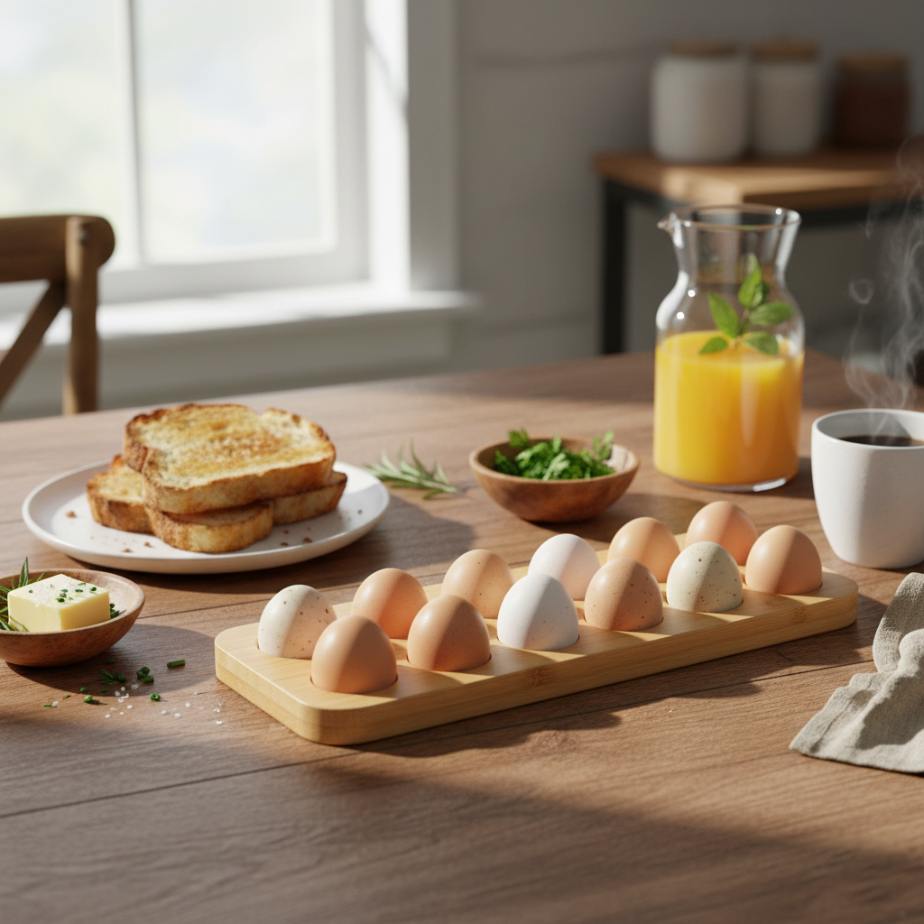 Our Bamboo Egg Cup is made from sustainable bamboo and features 12 hollows, providing space for up to 12 eggs at once. Its compact size of 30x11cm makes it the perfect addition to any kitchen, reducing clutter and providing an eco-friendly alternative to traditional egg cups.
