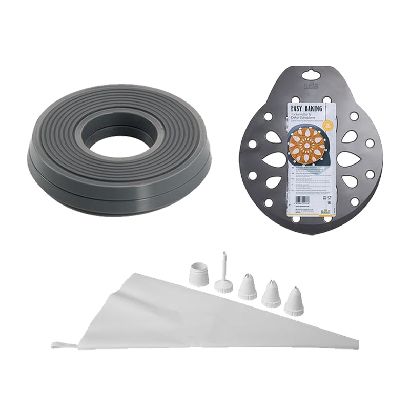 - The set consists of six parts and includes a 34 cm piping bag, an adapter, and four nozzles.