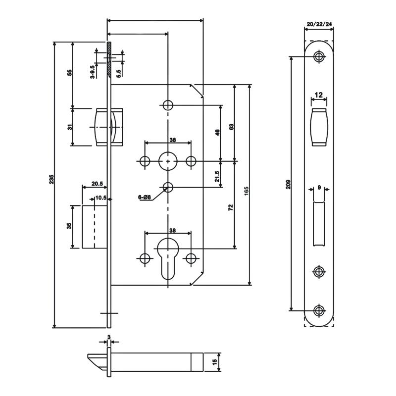 - Pierced to accept bolt through furniture and escutcheons at 38mm centres