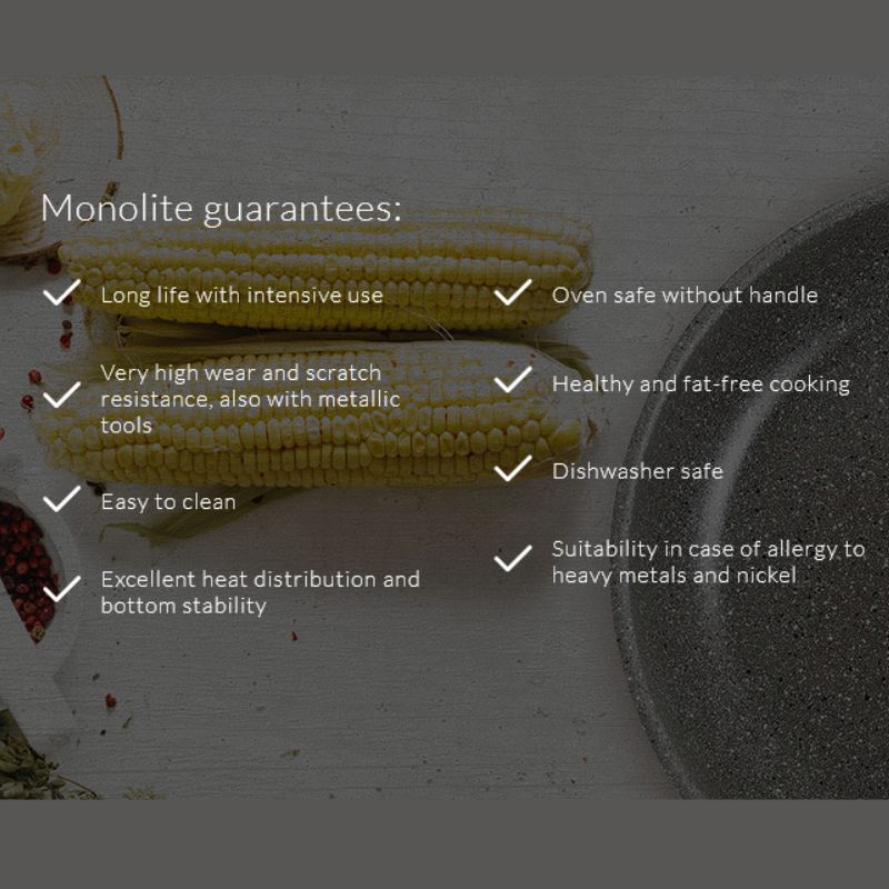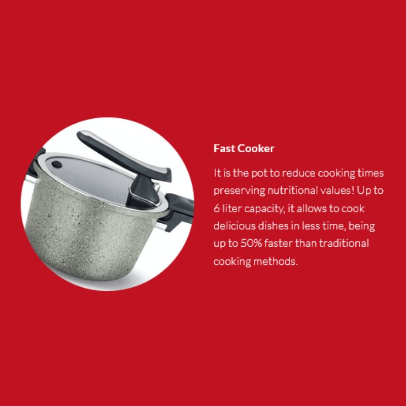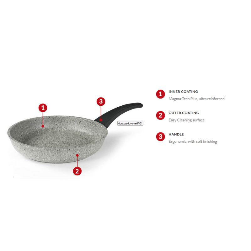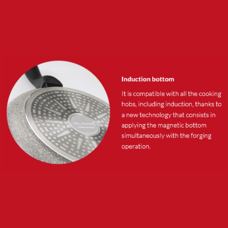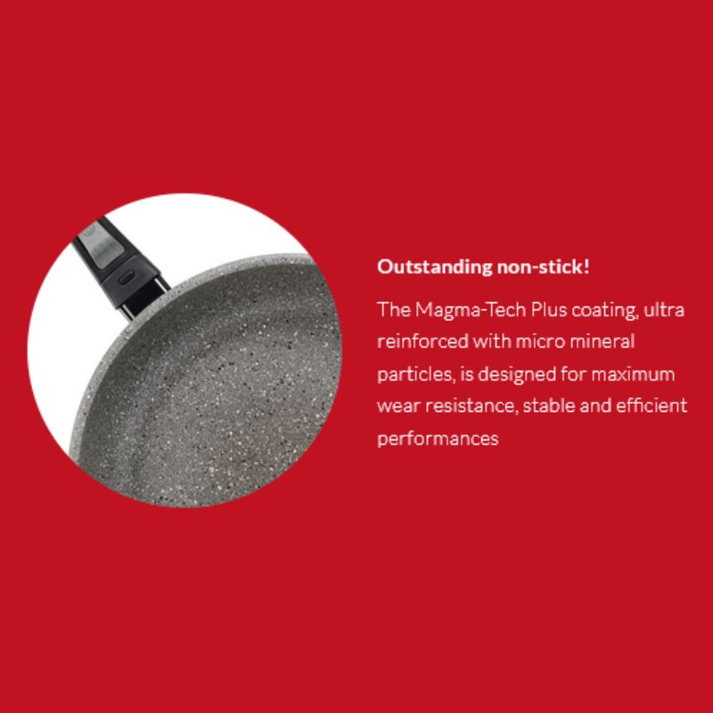 Fat-free / oil-free cooking. Ideal for healthy dishes. The Magma Tech Plus non-stick coating, reinforced with micro mineral particles, is designed for maximum wear resistance, stable and efficient performances, and healthy fat-free cooking, both for intensive use and for quick preparations. With particular attention to the purity of the materials used. Ideal for those who love 100% genuine cooking. Stability, strength, and reliability, are the characteristics of an eternal and natural material as the stone, which today returns to the kitchen with a modern and technologically avant-garde design.