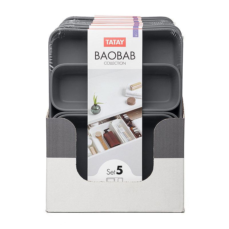 Get organized with Tatay€™s Baobab Organiser Set -- with their attractive anthracite grey design, these robust storage boxes are perfect for keeping drawers, dressing tables, tables, and worktops neat, organized, and tidy. Adding four grey trays in different sizes that may be used together or individually, depending upon your needs, this set may be used anyplace around the home, garage, or office. These modular boxes can be inserted into one another to make distinct storage configurations in drawers and on desks and vanities, and the smaller ones nest within the larger ones to save space when not in use. Appropriate for organizing all sorts of various items, these handy boxes are ideal for stashing stationery organizers, tools, kitchen utensils, makeup organizers, small toys, craft supplies, toiletries, and arbitrary bits, the list is endless. "
