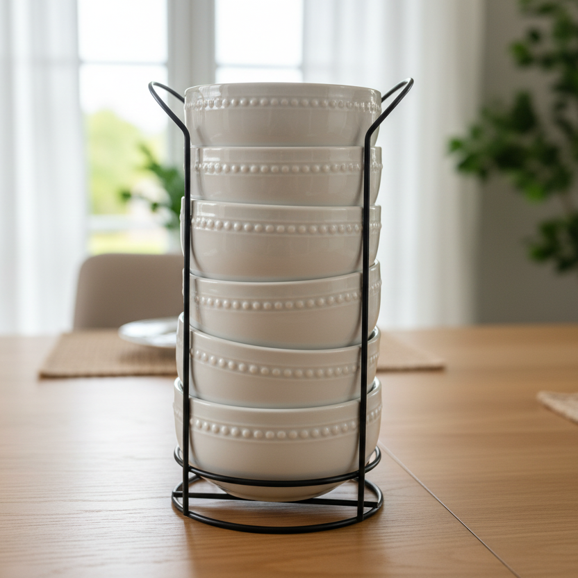 Transform your dining experience with this refined porcelain soup bowl collection. Comprising six generously-sized 800ml bowls in classic white, each piece sits atop a distinctive black stand that adds contemporary elegance to your table setting. The premium porcelain construction resists chipping and maintains its lustrous finish through years of use, while the elevated stands facilitate easy serving and create visual depth. Perfect for soups, broths, and light courses, the substantial capacity accommodates hearty portions without overflow. Whether hosting formal dinners or casual family meals, this coordinated set combines practical functionality with understated sophistication, making it an essential addition to any discerning home.