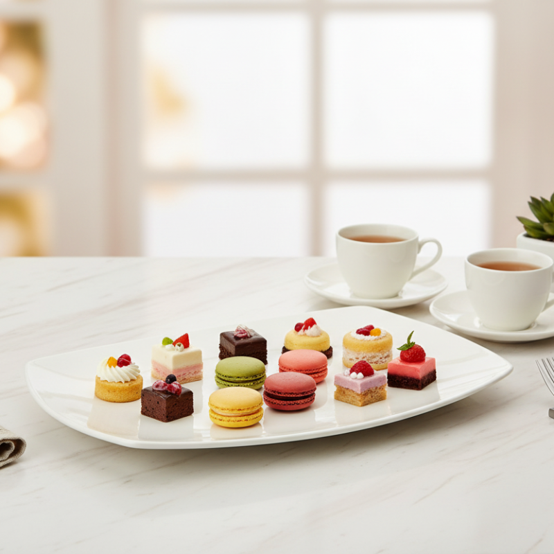 Elevate your table presentation with this refined rectangular porcelain serving tray, measuring 41cm in length. Crafted from premium porcelain, it combines timeless elegance with practical functionality, making it ideal for serving appetizers, pastries, or displaying decorative items. The pristine white finish complements any décor style, from contemporary to traditional settings. Its generous surface area and smooth glaze ensure easy cleaning and maintenance. Perfect for entertaining guests or adding a sophisticated touch to your dining experience.