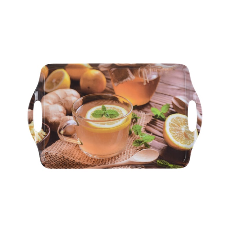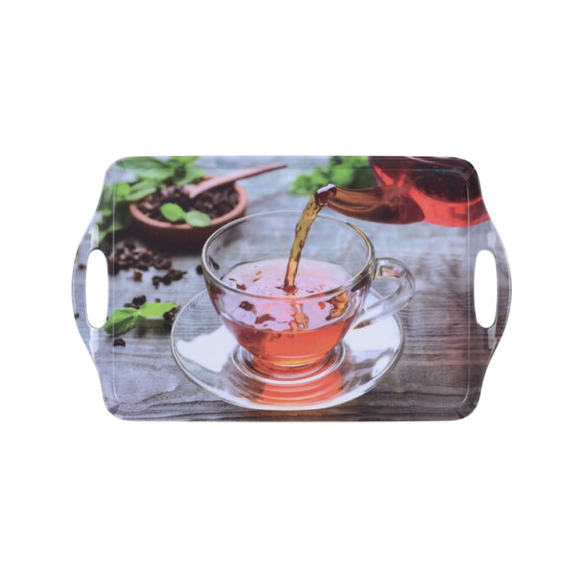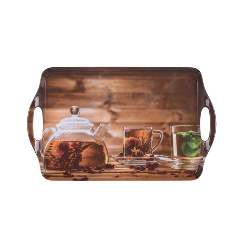 A large sized tray with tea designs imprinted on it. For us tea is a staple beverage, we drink at all times during the day, so why not have a tray which supports the occasion. The tray communicates the love and effort it goes into brewing the perfect tea.